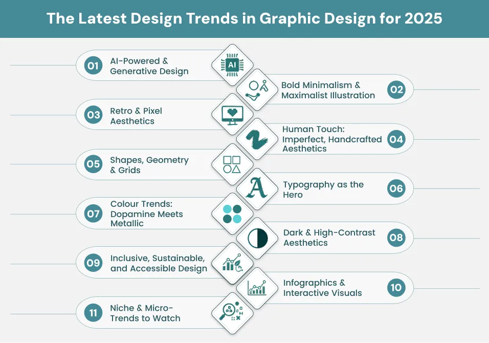 AI is changing how designers work. But in no way is it replacing them. In 2025, AI helps speed up ideas. It has suggested layouts and customised content for different users. It supports teams in moving from concept to final design quickly, without losing the human touch. These smart tools let designers do more with less effort. Now, you can turn voice prompts into images using AI. It also creates layouts based on your data. These tools save time and still keep the quality high. They offer safe design choices, live edits, and easy tweaks. AI-made infographics are becoming a key part of the latest design trends in graphic design. Instead of plain charts, brands now make unique infographics that speak to their audience. This shift shows a bigger change in current graphic design trends.