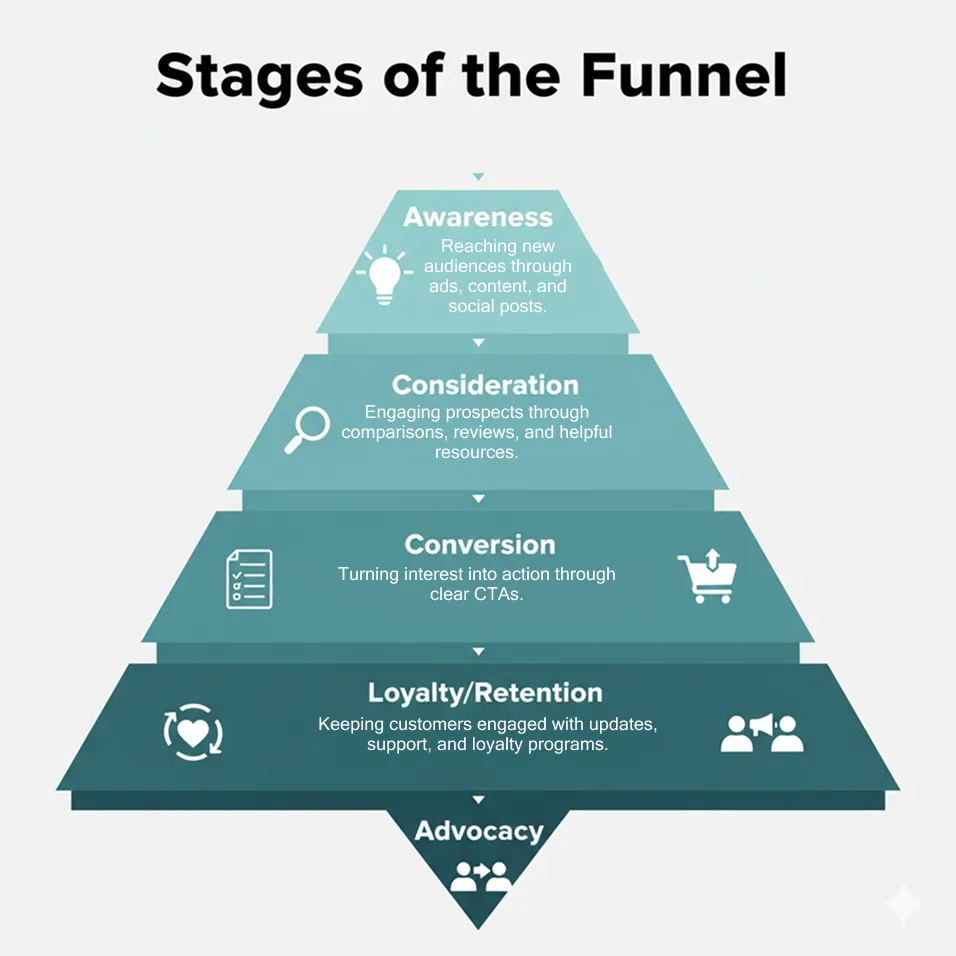 A marketing funnel is a step-by-step path that turns strangers into paying customers by guiding them through awareness, consideration, and decision stages.
