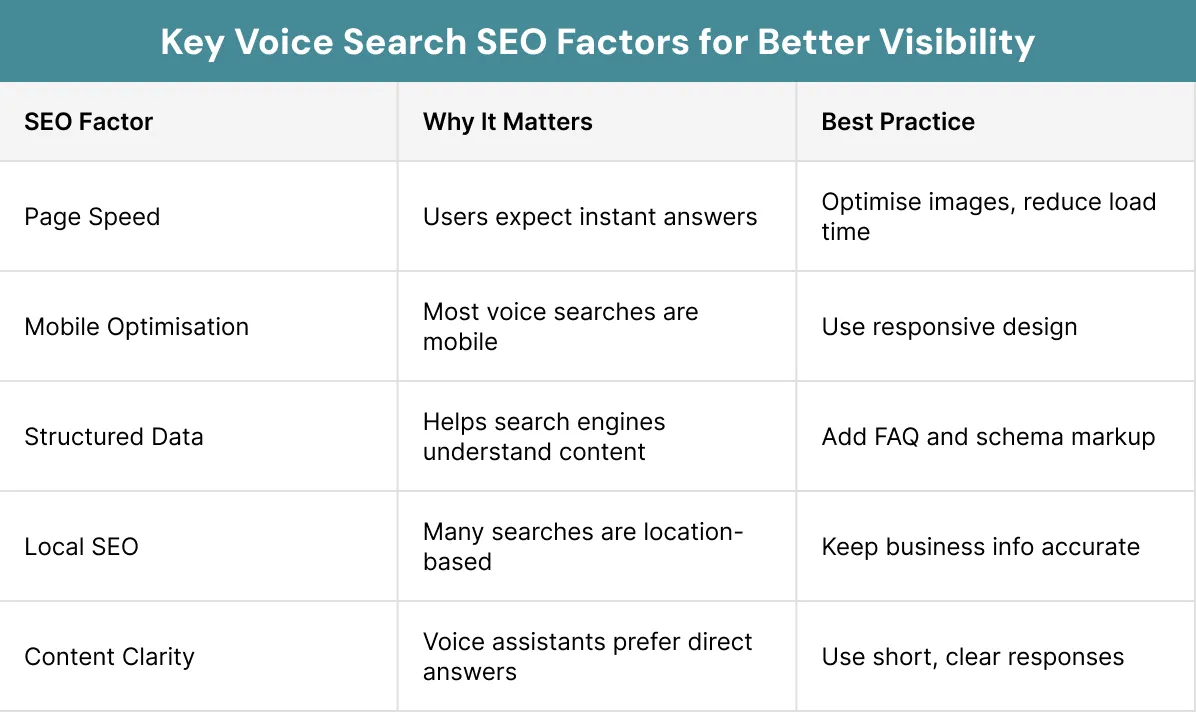 Slow-loading pages are less likely to be used for voice search results. Speed directly impacts visibility.