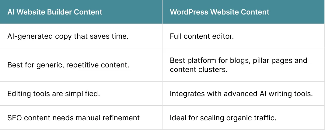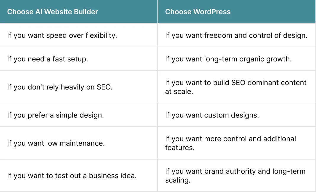 Anyone planning to scale content, compete in search rankings, or build custom functionality should avoid relying solely on an AI website builder.