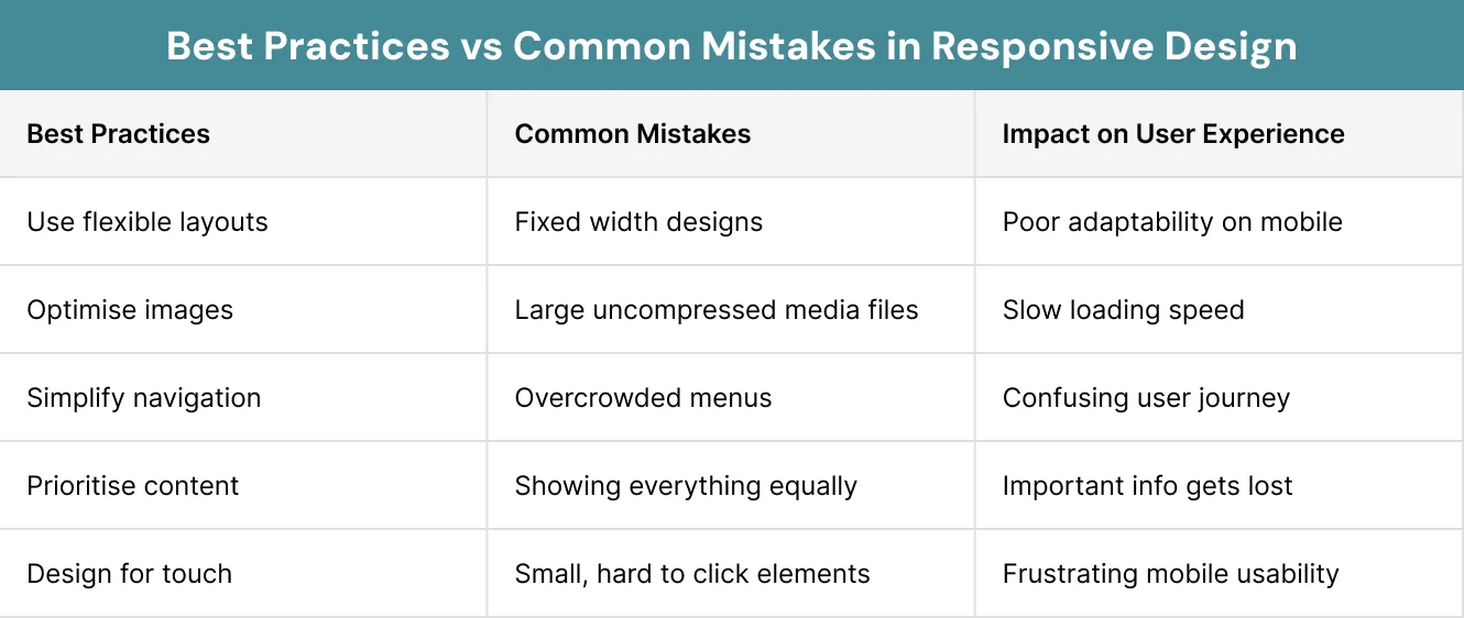 - User experience improves when content is prioritised, navigation is simplified and elements are designed to be touch friendly across all devices