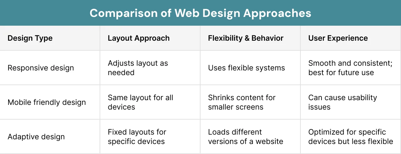 Various web design methods handle user experiences and layout differently. It helps you to know about responsive design and other methods. The differences are mentioned for you in the following table to see which method suits you.