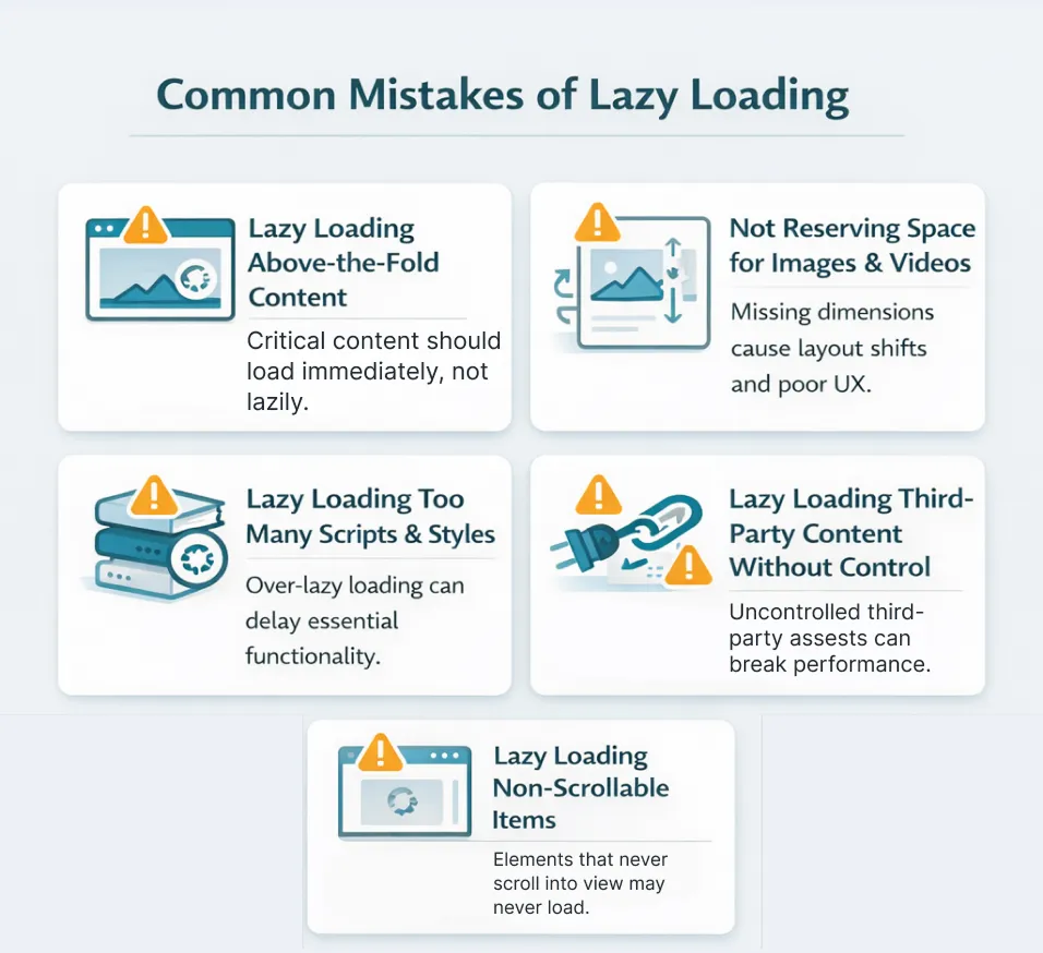 This is the most harmful mistake. When the hero image or main content is lazy loaded, the page opens and looks empty. The visitor waits again. Performance metrics become worse, especially Largest Contentful Paint. This makes the website look like it is failing.The fix is simple. Above the fold content should load normally. Only below the fold should be lazy loaded. Critical content needs priority.