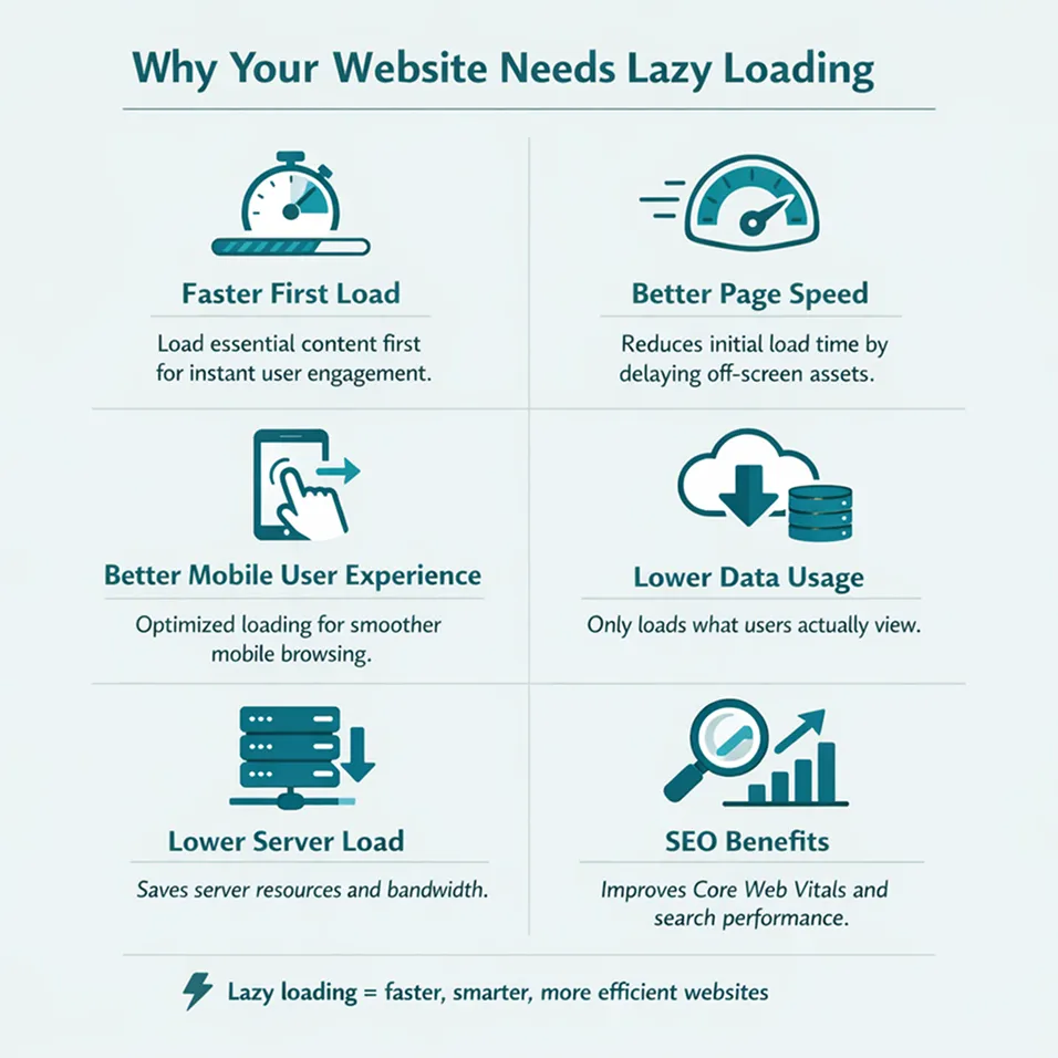 The main benefit of lazy loading images is faster initial page loading. Only the images that a visitor can see at the start load first. Images further down the page wait until the visitor scrolls. This saves time, reduces early data usage, and avoids loading images that the visitor may never reach. It also helps mobile users, where heavy images often cause the biggest slowdowns.